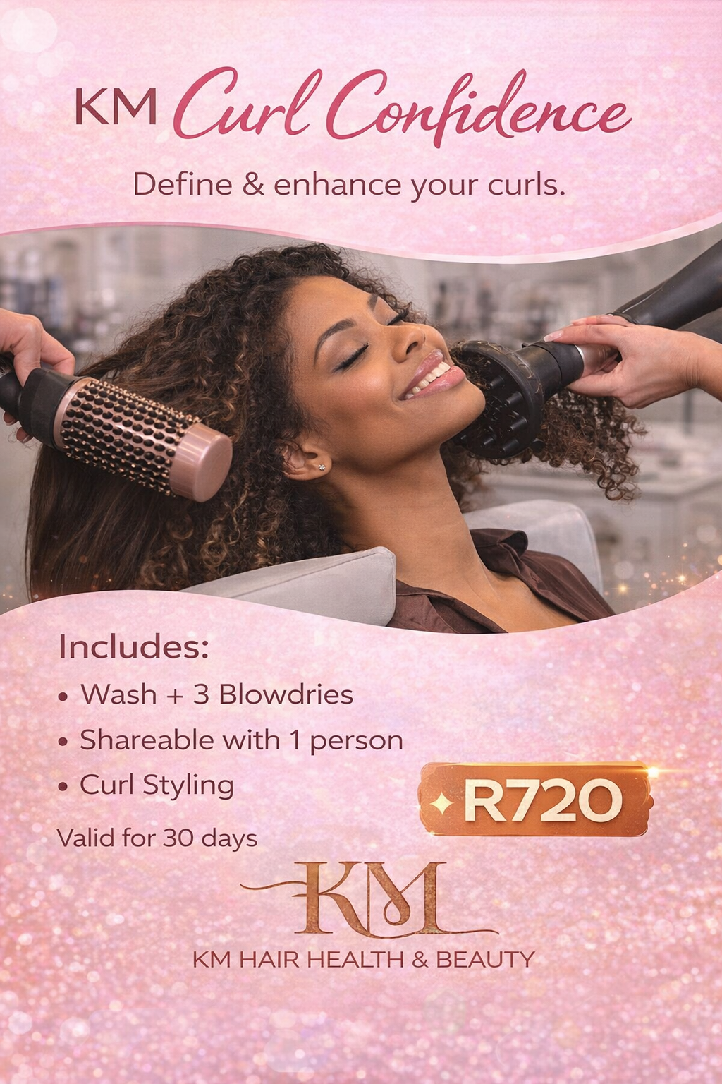 Enhance your natural curls with the KM Curl Confidence package. Includes two washes, 3 blowdries, or curl styling. Shareable with one person